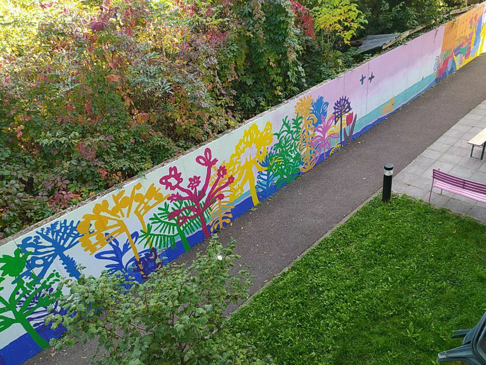 Atelier fresque avec les résidentes d'un accueil de jour, dessins réalisés par les femmes et fresque peinte avec elles !
